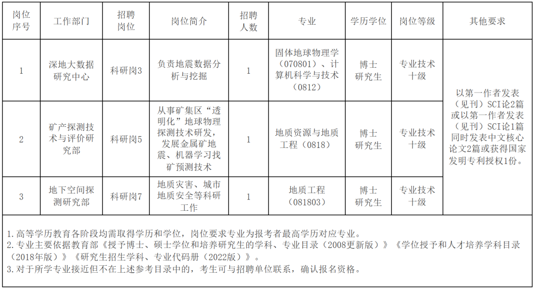 中国地质科学院成立于1956年,是新中国成立初期最早建立的四大科学研究院之一,也是我国地质专业齐全、规模最大、技术力量雄厚的社会公益类地学科研机构,是国家创新体系的重要组成部分。目前从事的研究领域包括基础地质、矿产地质、水文地质、工程地质、岩溶地质、环境地质、深部探测、物化探勘查技术、岩矿测试、矿产资源综合利用、地质遗迹调查等。根据单位事业发展和工作需要,现公开招聘应届毕业生3名,现公告如下:
