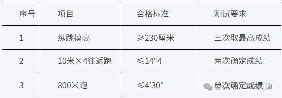 体能测评按照规定的标准和程序进行,体能测评采取单项淘汰方式进行,凡一项不达标的视为体能测评不合格。体能测评不合格的或未按要求参加体能测评的人员,不能进入面试;通过体能测评的人员,按照进入面试人数与计划招聘人数3:1的比例,从高分到低分的顺序,确定进入面试人员名单。达不到比例的,按照实际人数进入面试。笔试成绩相同的,一同进入面试。