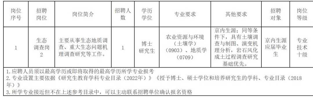 中国地质环境监测院(自然资源部地质灾害技术指导中心)是中国地质调查局直属的正局级公益一类事业单位,主要承担水文地质与水资源调查监测、地质灾害调查监测与防治、自然资源综合调查、资源环境承载能力与国土空间开发适宜性评价,承担国土空间生态修复技术支撑,向社会提供公益性服务。根据工作需要,拟面向社会公开招聘京内生源应届毕业生1人,现将有关事宜公告如下。