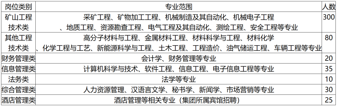 矿山工程技术类岗位限男性报名;酒店管理类岗位限女性报名;其他类别岗位性别不限。(二)招聘类别及具体条件